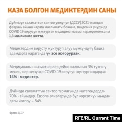 Кыргызстан бул апаатта илдет менен күрөшкөн 104 медицина кызматкерин жоготту. Алардын өлүмү кыргыз медицинасынын абалы жардын кырында экенин кашкайтып көргөздү.