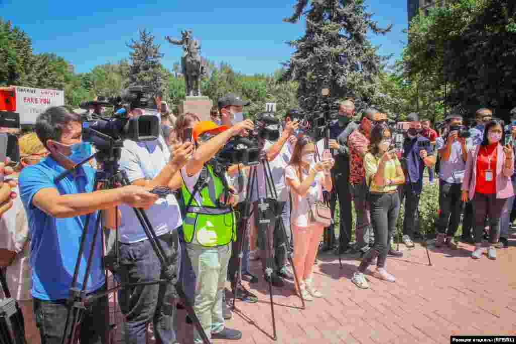 “Маалыматты манипуляциялоо тууралуу” мыйзам долбооруна каршы уюштурулган акциянын катышуучулары Эркиндик сейил багына топтолушту.